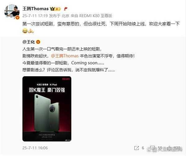 最近的小米可谓热点不断,60 万支 “大格局雪糕”还没开始,这又来了一个超级大瓜!小米中国区市场部总经理、REDMI 品牌总经理王腾,竟然跨界拍短剧,而且下周就要正式上线!