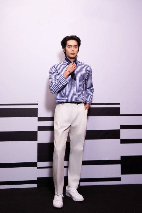 正赛日造型:身着Tommy Hilfiger定制藏青色学院风西装,搭配同品牌条纹衬衫、牛仔裤及小白鞋,整体造型被时尚媒体解读为“品牌行走的广告位”