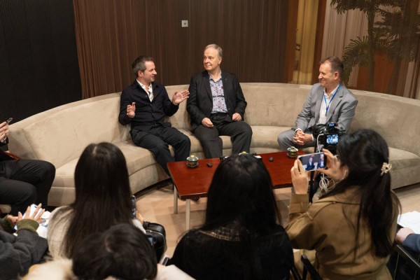 当晚音乐会前,BBC交响乐团团长Bill Chandler、指挥萨卡里·奥拉莫和法国钢琴家贝特朗·夏玛尤接受媒体采访。