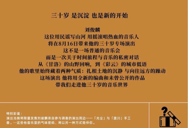 时光的磨砺让音乐更加璀璨,刘俊麟在过去的十年里,始终以匠人之心深耕音乐创作。他不仅是一位才华横溢的全能音乐人,更是一位敢于探索、不断创新的音乐先行者。现在,我们盛情邀请您共同参加「刘俊麟•三十而乐」生日音乐会,深入体验民族音乐与摇滚音乐交融所诞生的独特音乐世界。
