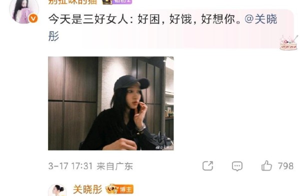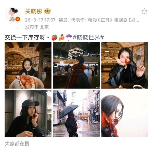 “交换一下库存呀~☔️晓晓世界”。 2026年3月17日,演员关晓彤在个人微博上敲下这行字,同时附上了一组六张生活照。 照片里的她或是举着草莓,或是与甜点合影,画面随意又温馨。 这条微博在发布后的几小时内,迅速爬上了热搜榜单,衍生出“关晓彤喂的草莓”、“关晓彤六宫格库存照”、“关晓彤交换库存”等多个话题标签。 然而,真正让这条动态在信息流中显得与众不同的,并非仅仅是明星晒照这个行为本身,而是那句“交换一下库存”的邀约,以及随之而来的一场规模可观的粉丝互动狂欢。