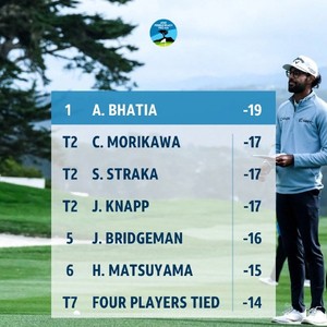 北京时间2月15日,加州时间星期六,美国选手阿克沙伊-巴蒂亚(Akshay Bhatia)凭借圆石滩前九洞的好表现,取得巨大领先,十分可惜,后九洞却下滑,最终交出68杆,低于标准杆4杆,进入圆石滩职业/业余配对赛最后一轮时领先2杆。