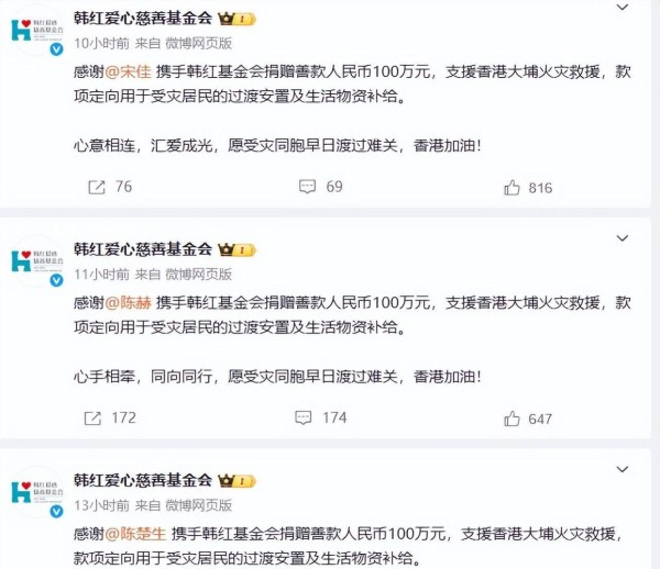 多位明星艺人为香港火灾捐款!韩红周深一马当先,张柏芝捐100万港币