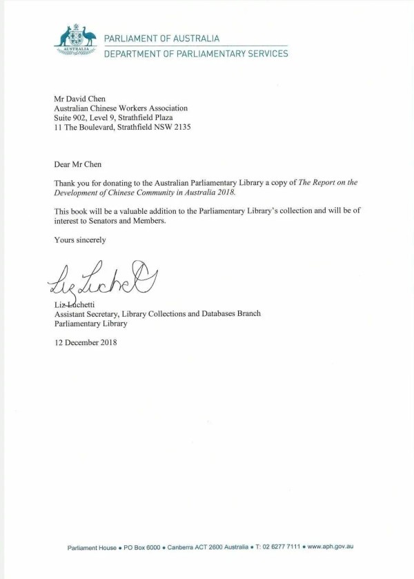 与此同时,陈青松主编的《澳大利亚华人社区发展报告2018》亦被澳大利亚国会图书馆(Parliamentary Library of Australia)收藏,并获得澳大利亚议会服务部(Department of Parliamentary Services)书面致谢。图书馆在致函中表示,该书“将成为国会图书馆馆藏的重要补充,并将对参议员和国会议员具有参考价值”(a valuable addition to the Parliamentary Library’s collection and of interest to Senators and Members)。这一评价表明,该报告不仅具有学术研究价值,同时也对公共政策研究与议会决策具有一定参考意义。该报告同时被澳大利亚外交贸易部收藏,并被全球两千余所大学图书馆系统收录,是近年来研究澳大利亚华人社区发展的重要文献之一。