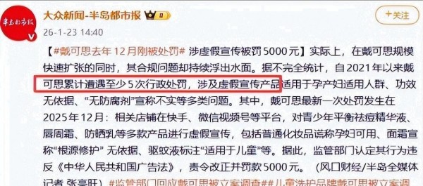 媒体梳理,戴可思在2021—2025年间累计5次行政处罚,涉及虚假宣传、无依据功效等
