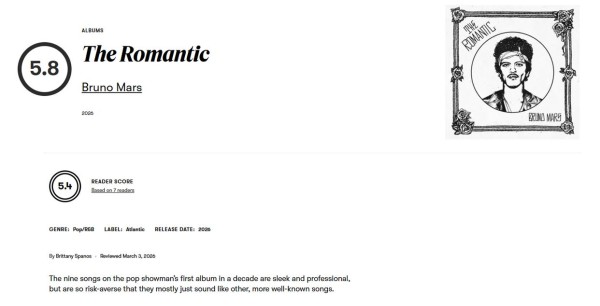 Pitchfork 乐评人为 Bruno Mars 时隔十年推出的全新个人专辑《The Romantic》打出了 5.8 分——这位流行巨匠十年来的首张专辑中的九首歌曲流畅而专业,但由于过于规避风险,听起来大多只是像其他更知名的歌曲。