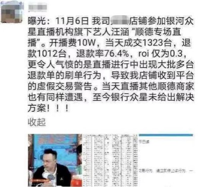 近日在网上疯传的朋友圈截图显示,有商家为汪涵直播缴纳了10万元开播费,当天成交量显示为1323台,但次日,却有1012台遭遇退货,退款率达76.4%。
