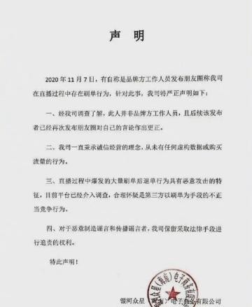 但是,对于当前网络上受到热议的汪涵”刷单“行为,银河众星第一时间发表了声明,称信息来源方并非品牌方工作人员,其朋友圈截图为虚假消息。