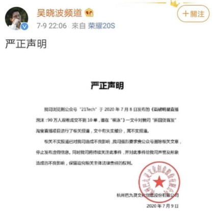更令吴晓波头疼的是,“15罐”事件在网上持续发酵,吴晓波不得不发出声明,指责文章部分报道内容失实,并发文解释称,根据官方平台的统计,交易金额为2200多万元,而此前官方发布的5000多万元交易额,是为了引导流量,把定金换算成了商品售价后的结果。