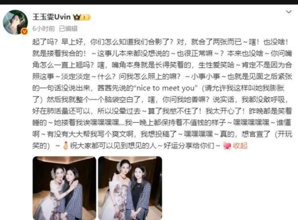 从王玉雯所发表的文字中,我们不难看出,她见到偶像时的那份激动与兴奋,毫不掩饰。那种略带羞涩的行为和有些尴尬的言辞,展现出她作为普通粉丝时的真实感受。无论一个人有多么光彩夺目,站在偶像面前,依然会有些紧张,甚至不知所措,这种真实的情感与普通人并无太多区别。