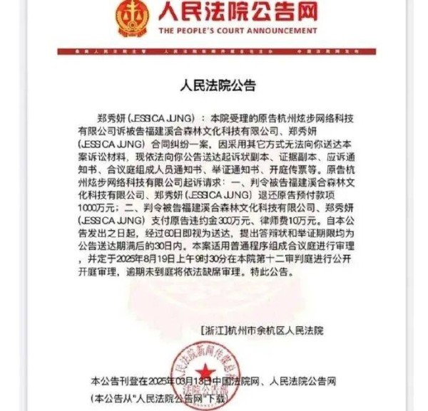 事件简述:杭州余杭区法院发布公告,杭州某公司起诉郑秀妍及福建溪合森林文化科技有限公司,要求退还预付款1000万元、支付违约金300万元及律师费10万元;