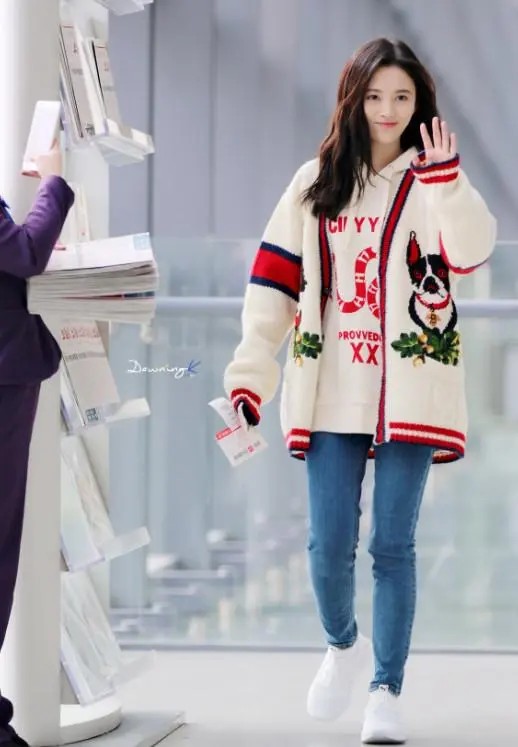 鞠婧祎身穿一件针织狗狗外套,内搭一件宽松款的连帽卫衣,休闲感十足,下身穿着一条牛仔裤,脚踩一双白色运动鞋,再配上甜美的笑容,看起来活力满满。