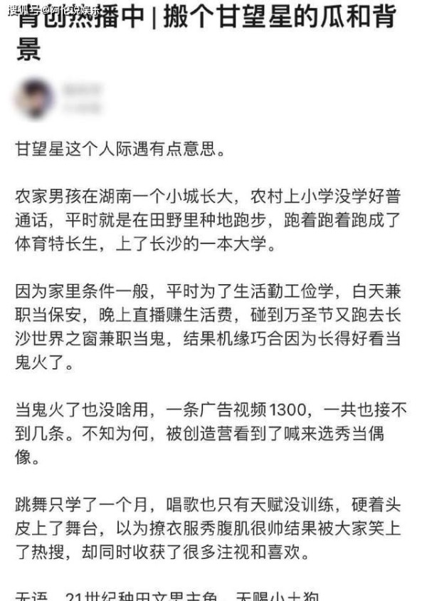 要说起最近最火的人是谁,就是甘望星了,根据资料显示,这个人和杨超越一样也是靠着机遇出道,农村男孩从小在湖南小城市长大,农谷才能上小学没学好普通话,平时就是在田野里跑着成为了体育特长生,上了湖南的一本大学,如果说这个学历是真的话,那么此人就是高智商学霸, 毕竟湖南的一本并不是这么好考的、当时由于家庭条件一般,他为了节省生活费,白天上课,晚上勤工俭学的打工,碰到万圣节又去长沙世界之窗兼职,在机缘巧合下因为长得好看当了鬼火。