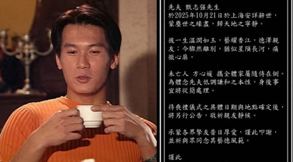10月21日,甄志强在上海打球时突发心脏病离世,享年59岁,前一天他还在社交平台更新视频和照片状态良好,10月31日妻子方心媛发布讣告确认消息