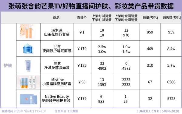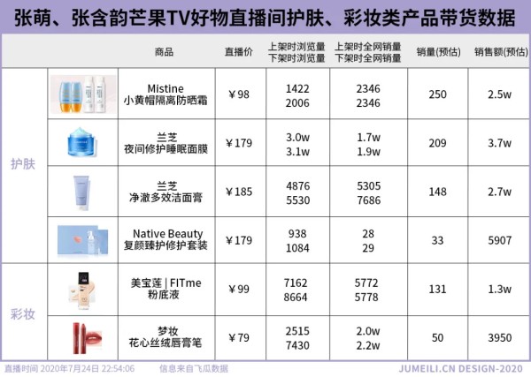 到7月24号晚上19:30,姐姐张含韵在芒果TV好物抖音直播间安利。飞瓜数据显示,当场观看人数达274.4w,人气峰值达10.4w,平均在线5.1w。从飞瓜数据后台看到,当晚直播分为两场,第二场也直播上架了一些彩妆及护肤品牌。