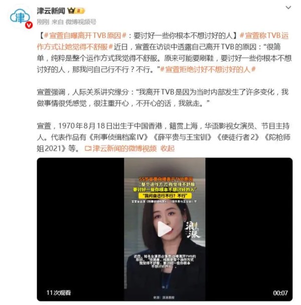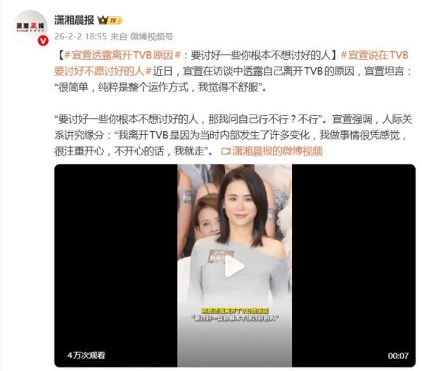 据2月2日报道,最近,TVB前当家花旦宣萱在访谈中的一番坦白,直接撕开了娱乐圈光鲜表皮下的某种“生存法则”。她离开老东家的理由干脆利落,没有含糊其辞的“寻求新发展”,而是直指核心:“纯粹是整个运作方式,我觉得不舒服,要讨好一些你根本不想讨好的人。”这句大实话,瞬间戳中了许多职场人的共鸣点。