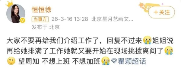 3月16日下午,瞿颖经纪人发文称:大家不要再给我们介绍工作了,回复不过来。她还透露瞿颖已经表态,“说再给她排满了工作她就又要开始在现场挑拨离间了,望周知,不想上班,不想加班!”