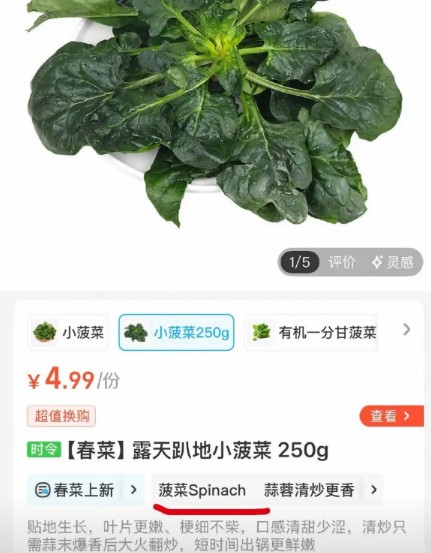 这期节目太火了,光点赞就接近100万,瞿颖自然备受关注,她的视频账号几天涨粉9万多,各大平台都在推瞿颖的搞笑切片。好多企业趁着热度蹭流量,盒马在菠菜产品介绍上加注英文标签,完成了一次借势营销。