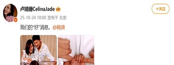 韩庚卢靖姗回应二胎出生:凑成“好”字,发文“我们的‘好’消息”