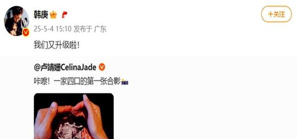 明星夫妻韩庚、卢靖姗官宣二胎出生,晒一家四口照片