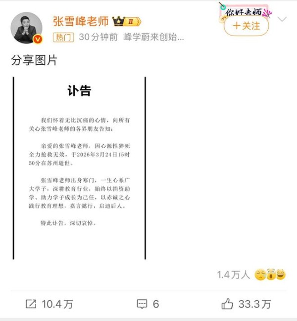 直到24日深夜,公司才通过张雪峰的社交账号发布讣告,证实张雪峰已经病逝,享年41岁。
