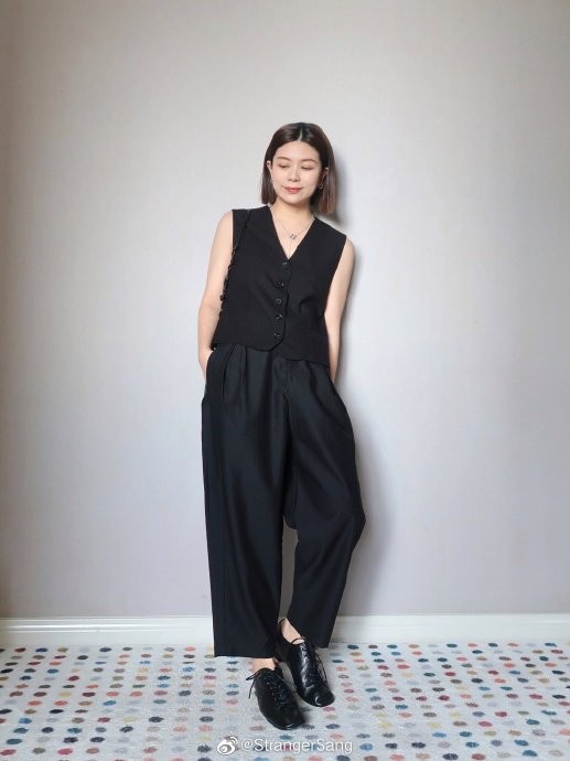 我的脖子短,如果像海狸那样穿小领T恤,再搭配西装久很拥挤,随后又尝试搭配了V领西装马甲,脖颈处露出来,反而更显瘦更随性一些,裤装也能随意更换,一套黑色内搭野遵循了极简原则,轻松打造高级感~