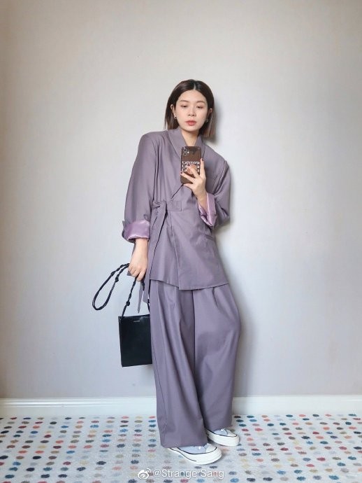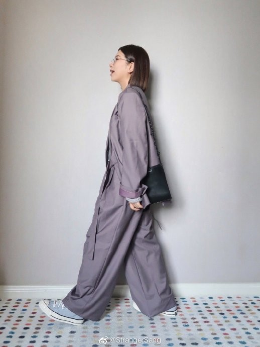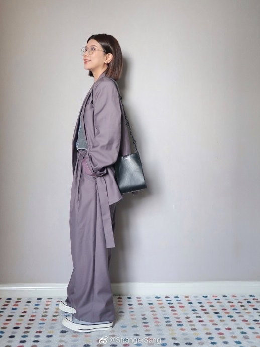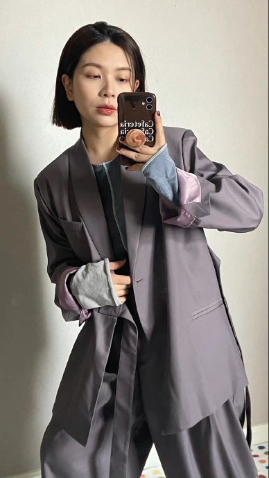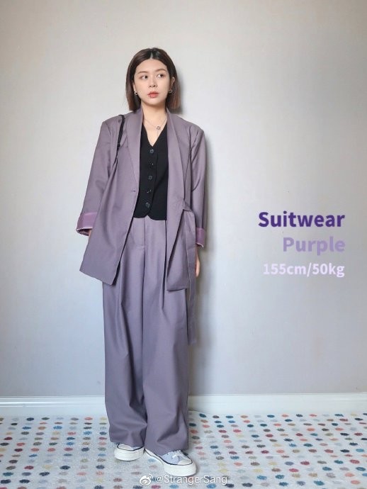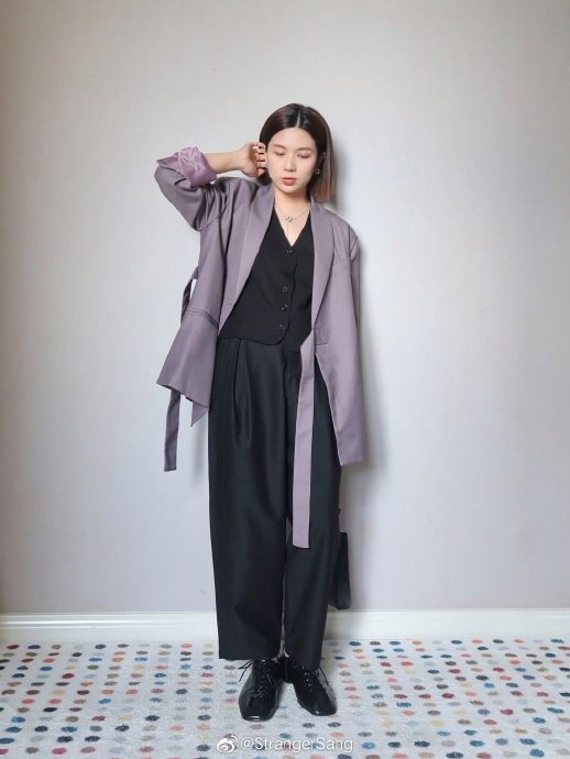 当我收到这套紫色套装的时候,立马想到同色系搭配,选择了都是低饱和度的拼接蓝灰T恤,和烟熏紫很相配,短款版型会更突出小个子的比例,哪怕外套有一些垫肩也不会夸张~ Althflow风一定要穿休闲鞋,才能摆脱西装带来的正式感;