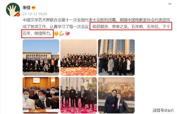 近日,在文代会结束后,作为代表之一参加会议的宋佳,在自己的社交媒体上晒出多张艺人大合照,引起网友的热议。