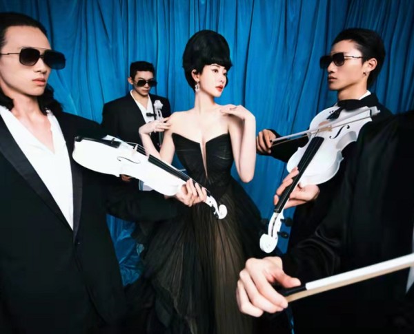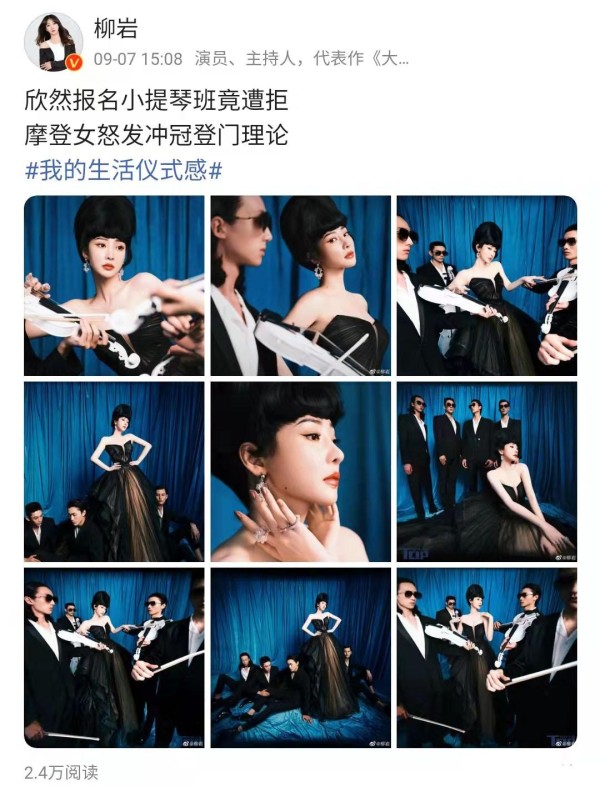 就拿柳岩坐在地上的这一张“工作照”来说,柳岩穿着一件黑色露肩纱裙,头上戴着一顶黑色的帽子,造型很有个性,显得她像豪门阔太太一样,在柳岩的身后还站在四位男模,这四位男模穿着西装,戴着黑色的墨镜,不仅将柳岩的气场衬托得更强大了,而且还营造出了一种独特的氛围感。