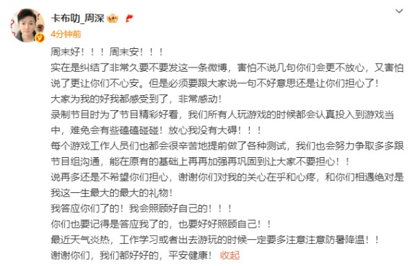 “大家为我的好我都感受到了,非常感动!录制节目时为了节目精彩好看,我们所有人玩游戏的时候都会认真投入到游戏当中,难免会有些磕磕碰碰!放心我没有大碍!每个游戏工作人员也都很辛苦地提前做了各种测试,我们也会努力争取多多跟节目组沟通,能在原有的基础上再加强再巩固到让大家不担心!”