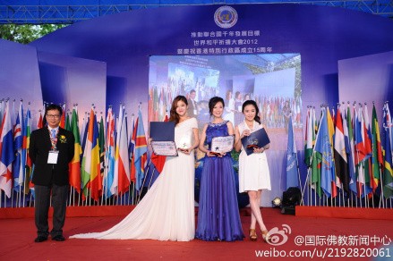 2012年4月20日在香港维多利亚公园与胡军、辽宁卫视主持人方亮、中央电视台CCTV-5体育频道主持人杨一同台主持由联合国友好理事会等国际组织共同主办的“推动联合国千年发展目标--世界和平祈祷大会暨香港特别行政区成立十五年”明星慈善演唱会,并获颁大会奖项--“关爱之星”奖章。2012年9月于美国洛杉矶圣盖博大剧院与与CCTV-5主持人杨一共同共持由联合国友好理事会、联合国艺术家理事会、世贸联合基金总会主办的“推广联合国千年发展计划世界和平祈祷大会美国侨学界慈善敬老活动”系列活动之“世界和平慈善演唱会” [5]。