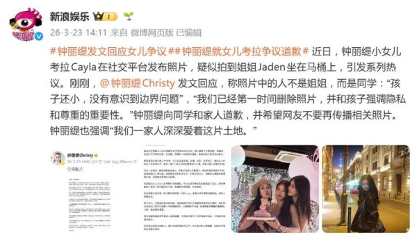 钟丽缇就女儿考拉争议道歉:孩子还小,没有意识到边界问题