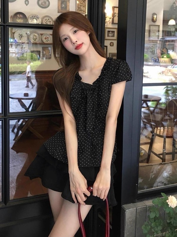 再看“出彩”示例。素人街拍中那些备受好评的波点单品,往往选择了截然不同的廓形。比如短款修身针织衫、A字短裙、合身连衣裙,这些廓形都在做同一件事——优化身材比例。短款提高腰线,修身设计勾勒曲线,A字下摆利落清爽,每一处剪裁都在为穿着者的身形做减法。