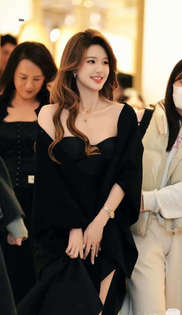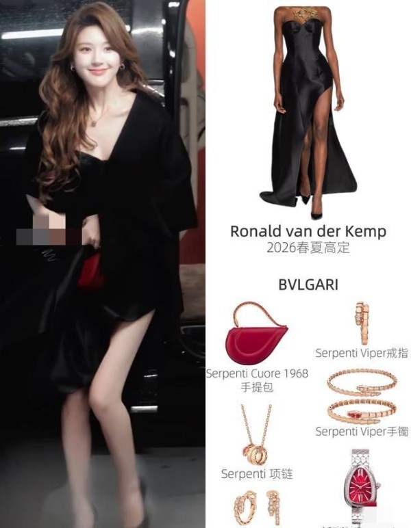 造型细节更是有看头:大波浪卷发配黑色礼裙,手提Serpenti Cuore 1968,整个人气场从容优雅。最抢眼的是那件Ronald van der Kemp 2026春夏高定——1月27日刚在巴黎发布,三天后就在上海被赵露思全球首穿,这种“先人一步”的时尚身份感很难不被注意。配饰多来自宝格丽灵蛇系列,她腕上那只马年限量表全球仅188枚,瞬间把高奢感拉满。