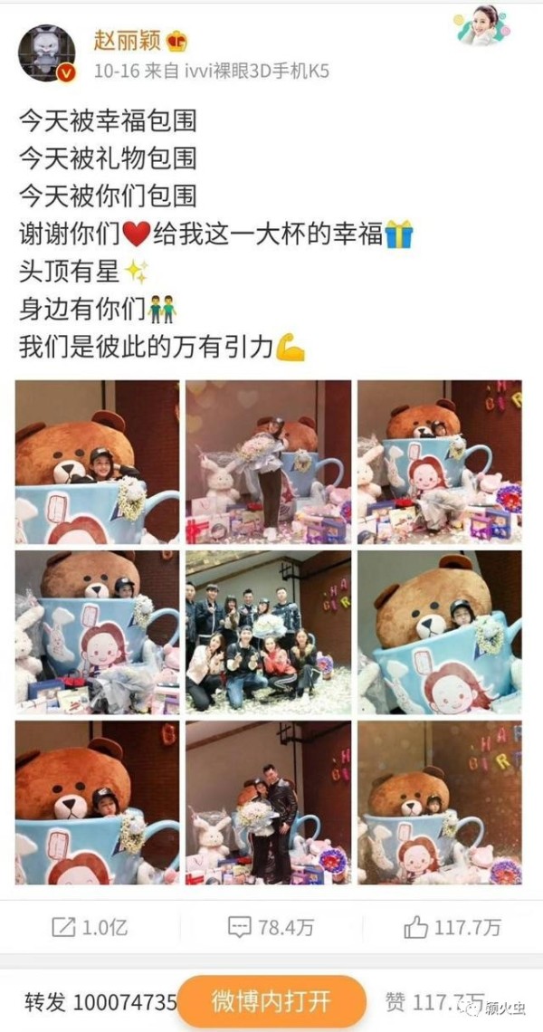 其实很多人是不玩微博的,但为了赵丽颖有人专门去开通去关注,有人专门去为偶像加油,虽然微博转发破亿只是一个数据,但这些数据背后是一份执着和坚持。