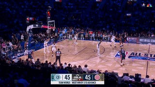 小卡率先轰进三分,唐斯回应追身三分,杜兰特招牌中投命中,文班炸裂暴扣以及补篮2+1,小卡和布伦森连续得分,穆雷轰进追身三分,布伦森立即回应三分,文班过掉小卡后再次暴扣,布伦森再中三分,唐斯回应大号三分,文班单挑杜兰特并且干拔得分,杜兰特扛着文班杀到禁区得分,穆雷再中三分,西亚卡姆跟进暴扣,世界队27-20领先7分。
