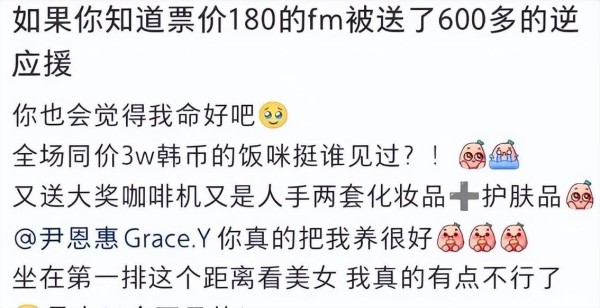 这场票价争议折射出当前演艺市场的畸形现象。原本应该是明星回馈粉丝的温情聚会,却演变成赤裸裸的"割韭菜"行为。细看两地见面会的服务内容,更凸显出定价的不合理:中国场次最贵的1520元门票,仅包含签名合影等基础互动;而韩国场次180元的门票不仅提供相同服务,还额外赠送价值数倍于票价的礼品。如此悬殊的待遇,难怪中国粉丝会感到被区别对待。