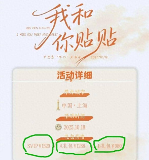 据官方公开的信息,上海见面会设置了三个档次的票务方案:SVIP礼包售价1520元,A礼包1288元,B礼包980元。这个价格一经公开,立即在社交平台掀起轩然大波。更令网友愤慨的是,就在今年7月,尹恩惠在韩国举办的同类型见面会,票价仅折合人民币180元,还附赠价值600元的精美礼品。