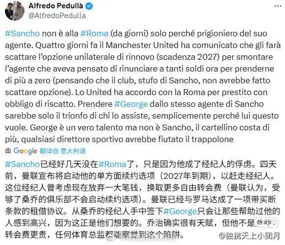 意大利知名记者佩杜拉,独家披露了罗马向曼联租借桑乔的惊人内幕,其经纪人压着这笔交易来赚大钱,具体如下: