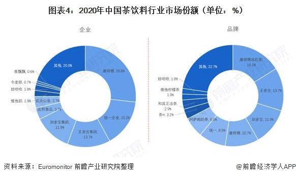 根据Euromonitor提供的中国茶饮料市场竞争格局来看,2020年,不管是从企业还是品牌来看,康师傅所占的市场份额都稳居第一位。