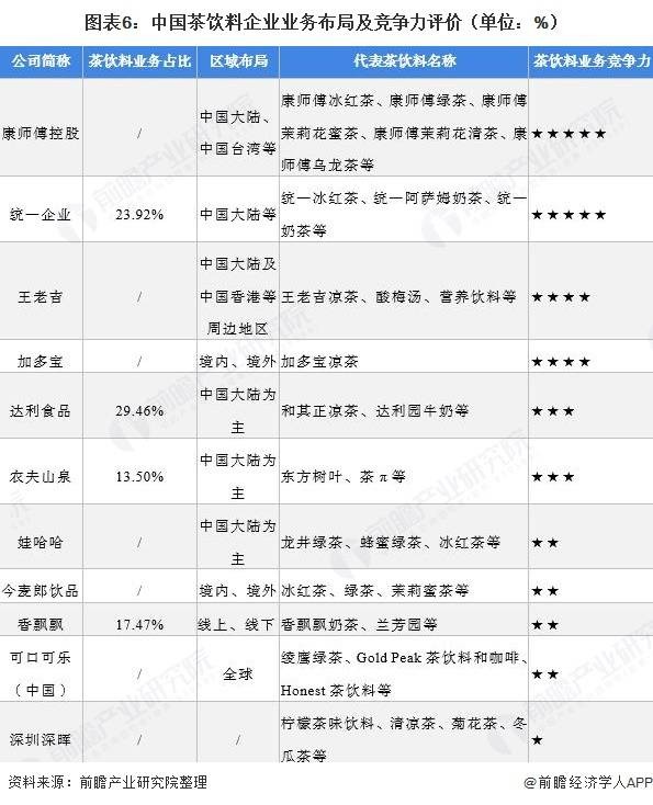 在我国茶饮料行业主要企业中,康师傅控股、统一企业、王老吉、加多宝、农夫山泉等,其中,康师傅控股和统一企业的冰红茶、绿茶等产品在市场上较有竞争力,王老吉、加多宝、达利食品等企业则以凉茶为主要竞争产品。具体的中国茶饮料企业业务布局如下: