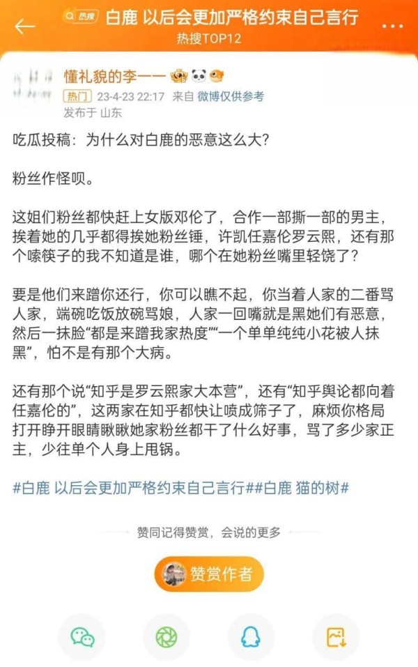新一代艺人正面临前所未有的两难困境。过度“安全”可能导致人设扁平化,失去粉丝黏性;过度“个性”则易触发风险。白鹿的经历便是一个典型案例。2023年4月,她因“精神男人”“母狗”等争议言论陷入舆论漩涡。在舆情失控后,白鹿选择亲自发布道歉声明,承认“未恰当表达观点造成不适”,承诺“严格约束言行,避免不尊重词汇”。