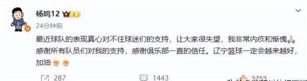 紧接着,杨鸣自己在社交媒体上发声了。 他写了一段话,向所有辽宁球迷道歉。 他说最近球队的表现对不起大家的支持,让球迷失望了,他感到非常内疚和惭愧。