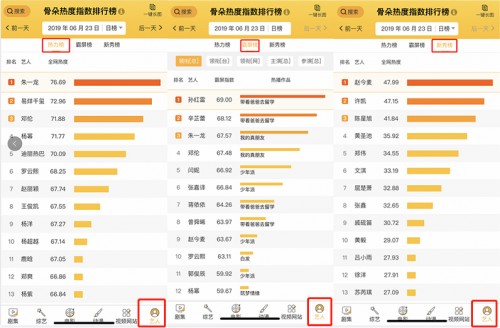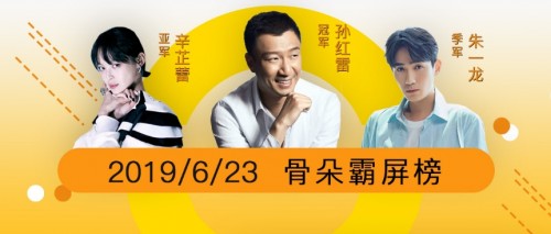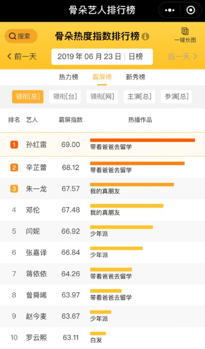 相对于其他榜单而言,骨朵演员霸屏榜时效性更强,靠作品说话,且不只限于领衔主演,讨论度与热度高的出彩配角也能在参演总榜上得到体现。以2019年6月23日榜单为例,领衔主演的总榜上《带着爸爸去留学》中的三位演员孙红雷、辛芷蕾位居一二名,朱一龙则是凭着《我的真朋友》中温柔精英的男二井然一角各列第三位。参演榜前三则被热播剧《少年派》的三位配角李至强、南吉与杨新鸣承包,以数据告诉大众告诉谁是荧屏之王。