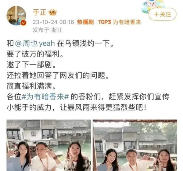 距离艺术节开幕还有数日,之前出席了一些节目的于正又和周也一起吃饭了。两人的新戏《为有暗香来》现在热度很高,引起了不少人的热议,而于正则是抓住了这个契机,对周也进行了重新的邀约。