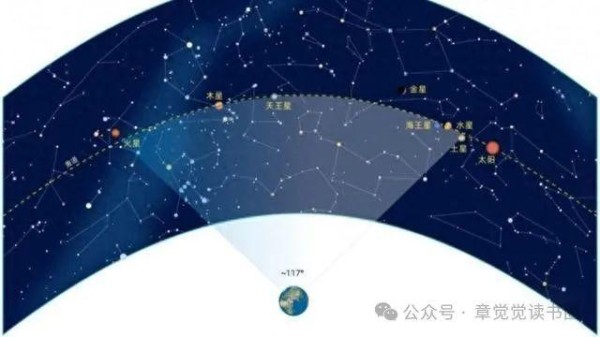 张角指的是最西边和最东边两颗行星与地球形成的夹角,只有张角小,几颗行星看上去聚集在较小的一片天空,才能显得独特。而据专业人士说,像这次这种张角接近120度的“七星连珠”,三五年里总会发生一次。