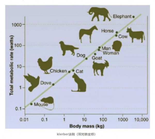 在1932年,生物学家克莱伯做了一组实验,他将各种哺乳动物拉到称上称体重作为横坐标,大到几顿重的大象,小到几十克的耗子,然后通过它们在单位时间内呼出的二氧化碳,分别测量出它们的新陈代谢率作为纵坐标。