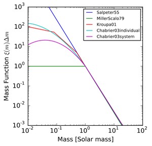初始质量函数的一些模型遵循分段幂律; Kroupa(2001)红色