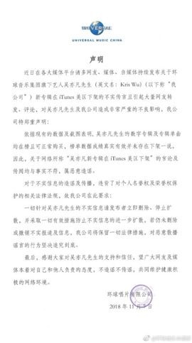 没多久,环球唱片有限公司出了一份公关声明,力鼎吴亦凡并要对“吴亦凡新专辑在iTunes美区下架”的言论保留一切法律措施。这篇公关的水平着实有限,属于下乘之作,避重就轻,想歪打正着转移视线基本没戏。最基本的点你环球唱片要清楚,你没下架和你刷榜是毫不相关的两回事。公众的注意力在你刷榜而不是谁造你的谣。