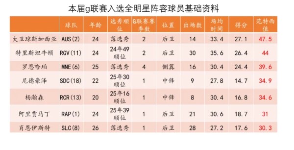 首先我们来看一看本届入选G联赛全明星阵容球员的基础资料情况,从表格中我们可以看到包括了三个25年新秀、一个24年新秀以及三个落选秀,且这七名球员除了罗恩哈珀在G联赛打了4个赛季、剩下6名球员都是一年级或二年级生。